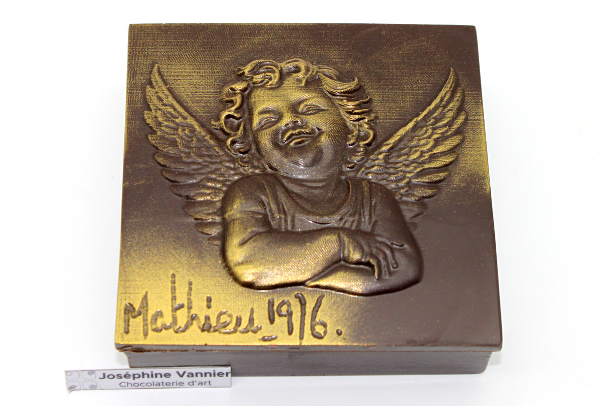 Cette boîte en chocolat noir 72% marie puissance aromatique et expression artistique. Son couvercle, sculpté en relief, reprend l’ange iconique du street artiste Mathieu 1976, dans une interprétation subtilement patinée de reflets dorés.