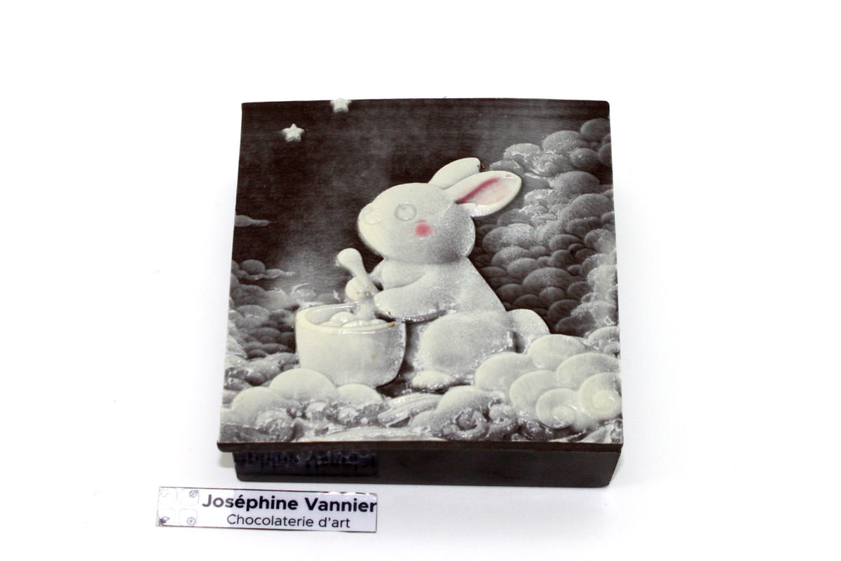 Cette boîte en chocolat noir au format 9x9cm évoque l’univers délicat des illustrations anciennes. Son couvercle présente une scène en relief représentant un lapin dans un décor nuageux, inspirée des estampes traditionnelles. Les nuances de chocolat et les effets poudrés apportent profondeur et douceur à cette composition visuelle, transformant la boîte en véritable objet gourmand illustré.