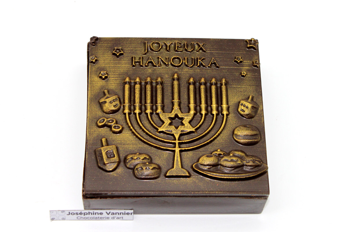 La boite hanouka en chocolat noir 11x11cm est une création emblématique de la Chocolaterie d’art Joséphine Vannier. Entièrement moulée et décorée à la main, elle met à l’honneur les symboles traditionnels de Hanouka : une magnifique menorah en relief, des dreidels, des étoiles, des anneaux et des beignets typiques de la fête.