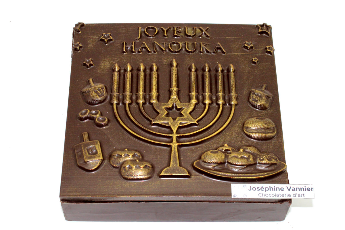 Célébrez Hanouka avec l’un de nos plus beaux symboles gourmands : la boite hanoukka 14×14 cm en chocolat noir. Entièrement réalisée à la main dans notre chocolaterie d’art, elle présente un décor en relief représentant la menorah, les toupies traditionnelles et les douceurs emblématiques de la fête.