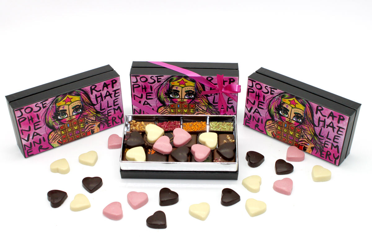 Élégant écrin de chocolats, entièrement désigné par Raphaëlle Emery et produit en France. Chaque écrin est garni de 150 grammes d’un assortiment de chocolats issus de la collection de Joséphine Vannier, ainsi qu’un panaché de cœurs chocolatés Raphaëlle Emery.