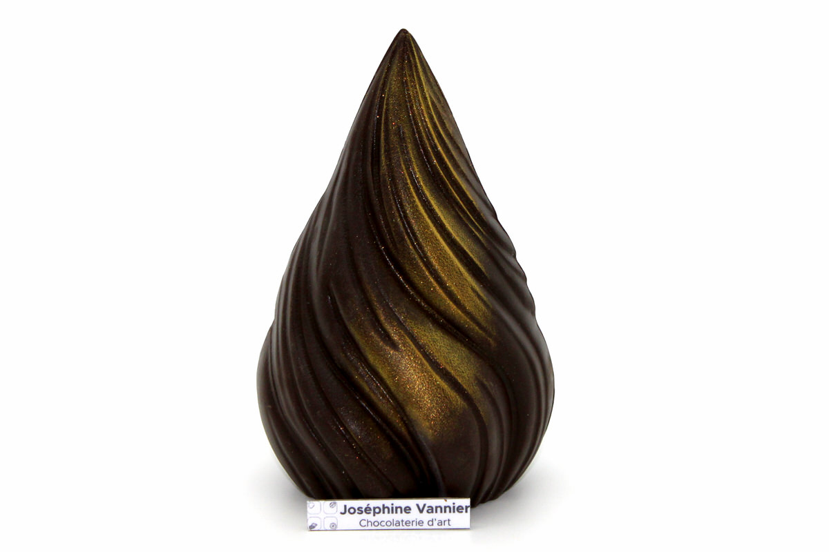 Ce flacon en chocolat noir artisanal se distingue par sa silhouette élégante, mêlant mouvement et finesse. Ses lignes spiralées créent une forme de flamme sculptée, qui peut également rappeler un sapin de Noël contemporain, à la fois épuré et artistique.