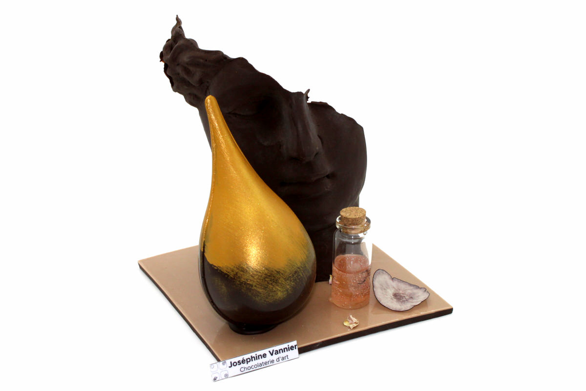 La plaque parfum “elle” 14x14cm est une création emblématique de la chocolaterie d’art Joséphine Vannier. Sur une plaque de chocolat finement moulée repose une sculpture féminine délicatement brisée, accompagnée d’un flacon doré en chocolat et d’une fiole décorative (en verre, non comestible).