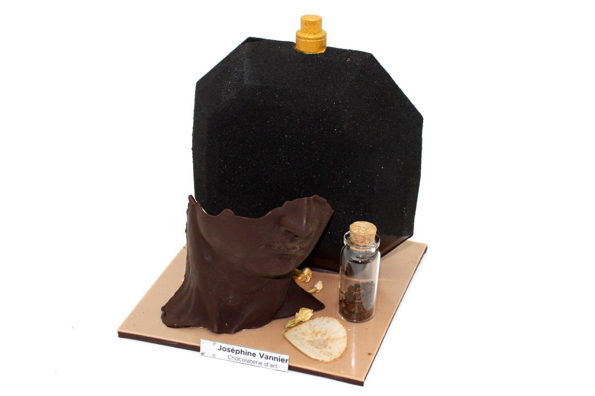 Sculptée entièrement à la main dans notre chocolaterie d’art, la plaque parfum “lui” 14x14cm rend hommage à l’esthétique des fragrances masculines. Son large socle en chocolat accueille un flacon noir mat effet velours, surmonté d’un spray doré, accompagné d’un visage masculin sculpté dans le chocolat noir.